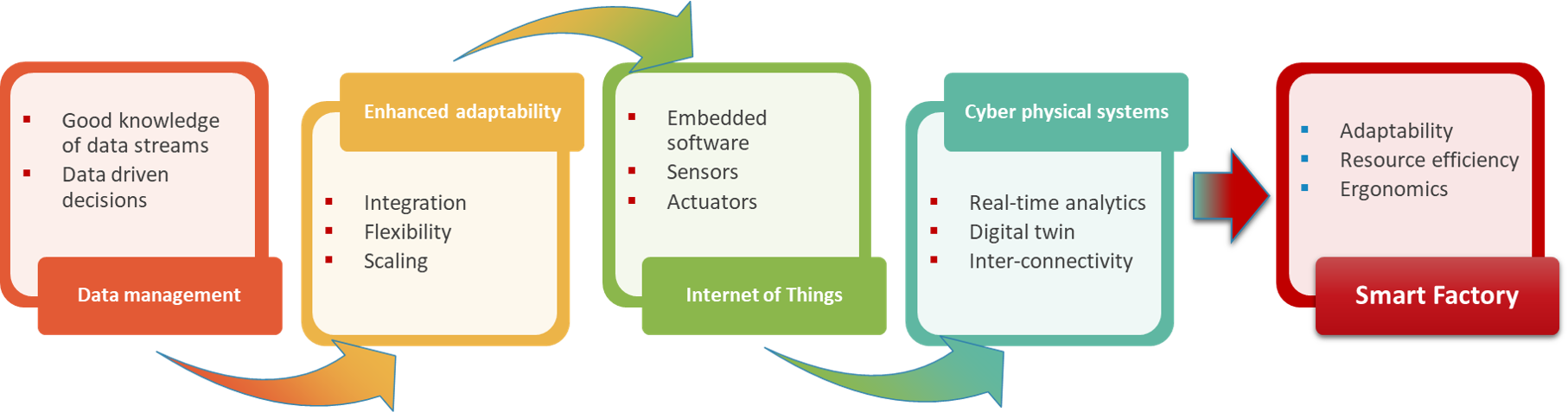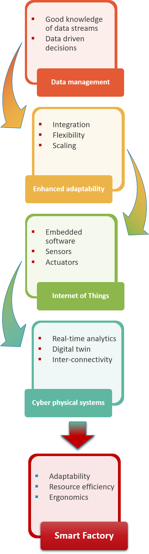 We have identified 4 key areas of focus for turning the smart factory concept into reality and have developed a stepped approach towards this goal. We consider these to be the cornerstone for each organisation operating in the industrial manufacturing area wishing to adopt the smart factory concept in order to make the most out of the newest technological developments. Highlights of these steps are illustrated below: